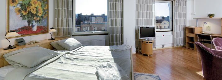 Rummen har brandlarm, bad, kylskåp, kassaskåp och kabel-tv. Det finns även rum med pentry. Till gästernas förfogande står hotellets dam- respektive herrbastu och solarium. Te och kaffe finns i Cafeterian från kl. 14.00. Vi har Telia homerun, trådlöst internet, i hela fastigheten.